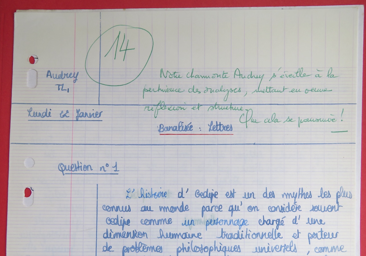 La semaine dernière, j’ai attaqué le palier de ma chambre. C’est un point chaud où j’empile tout ce que je ne veux pas prendre le temps de trier et de ranger. Un amoncellement de papiers divers et variés d’importance variable. En ouvrant une vieille chemise à élastiques (dont les rabats se sont délités sous mes doigts), j’ai retrouvé des copies du collège et du lycée – dont celle que j’ai photographiée ci-dessus.