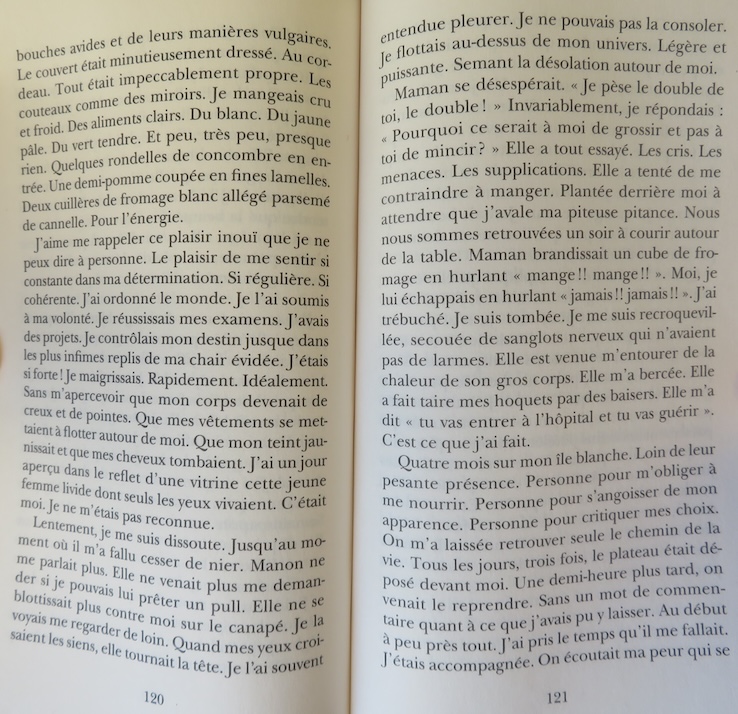 « J’aime me rappeler ce plaisir inouï que je ne peux dire à personne. Le plaisir de me sentir si constante dans ma détermination. Si régulière. Si cohérente. J’ai ordonné le monde. Je l’ai soumis à ma volonté. Je réussissais mes examens. J’avais des projets. Je contrôlais mon destin jusque dans les plus infimes replis de ma chair évidée. J’étais si forte ! […] J’ai un jour aperçu dans le reflet d’une vitrine cette jeune femme livide dont seuls les yeux vivaient. C’était moi. Je ne m’étais pas reconnue. » (p.120)